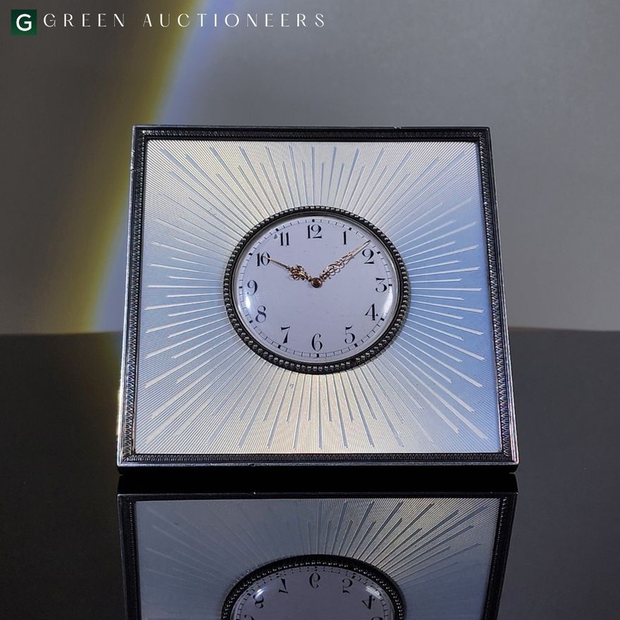 A stunning and rare Art Deco leather and chrome clock, two tone dial and large applied chrome indexes outside the bezel. Manual winding 8 days movement. Width: 150mm. Height: 160mm. Dial signed Jaeger.