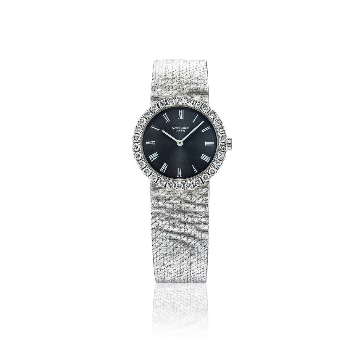 18K白金,灰色錶盤和鑲鑽錶圈。手動上鍊機芯。直徑26 毫米。